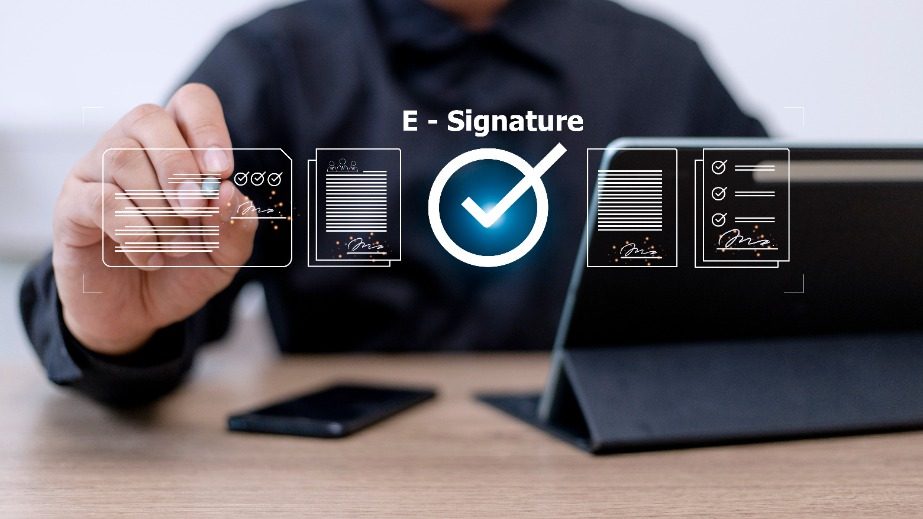 Businessman, work from home, handling documents, E-signing, signing digital contracts electronic signing electronic signature through internet technology document data management smart contract